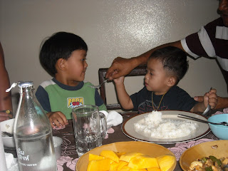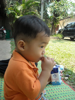 He has already said his first english word. This morning playing soccer with Mommy and Daddy he pointed at the ball and said “Ball” then kicked it. We are duly impressed. His Thai vocabulary that we’ve identified so far is mostly “Eat” “Hungry” “GO” “Car” “Grandmother” and “Cat”.